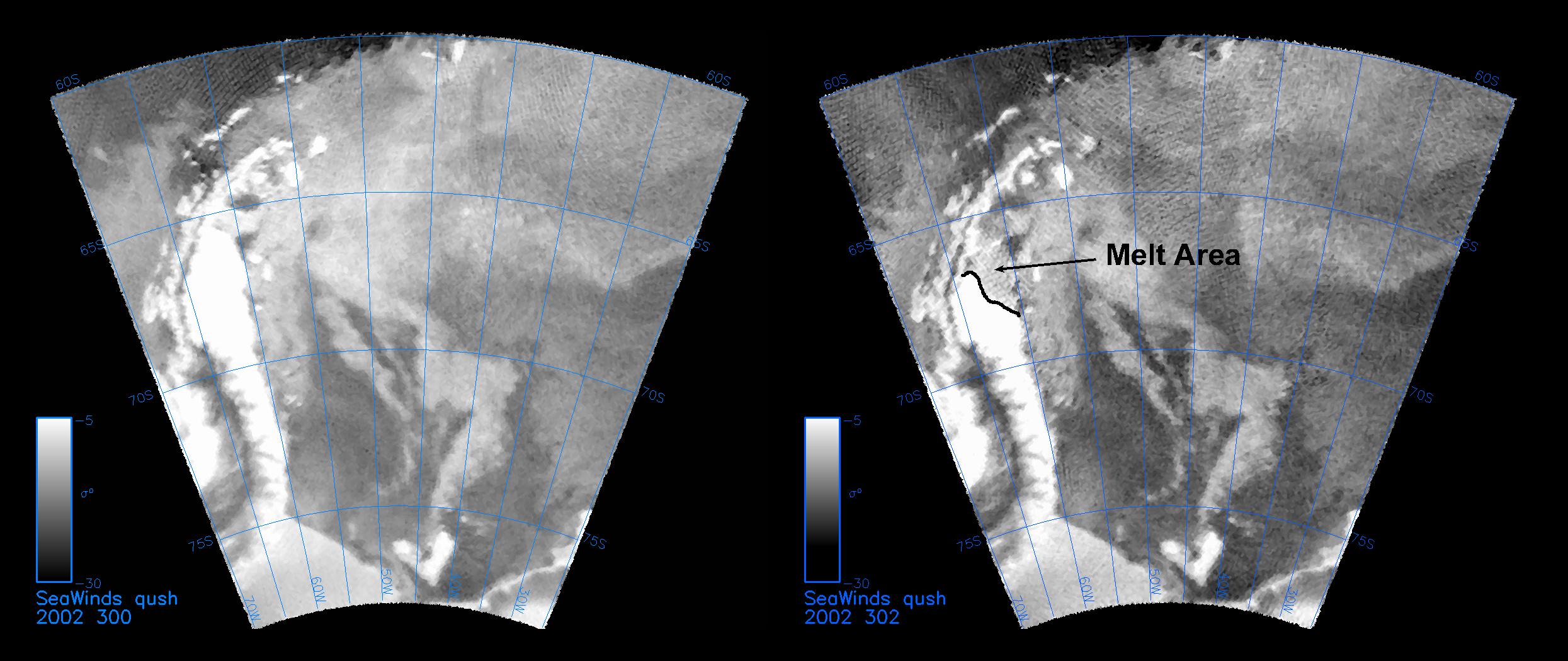 The SeaWinds instrument on NASA Quick Scatterometer QuikScat spacecraft captured these near-real-time backscatter images of melting on the Larsen C ice shelf in Antarctica Weddell Sea between October 27 left and October 29 right.
