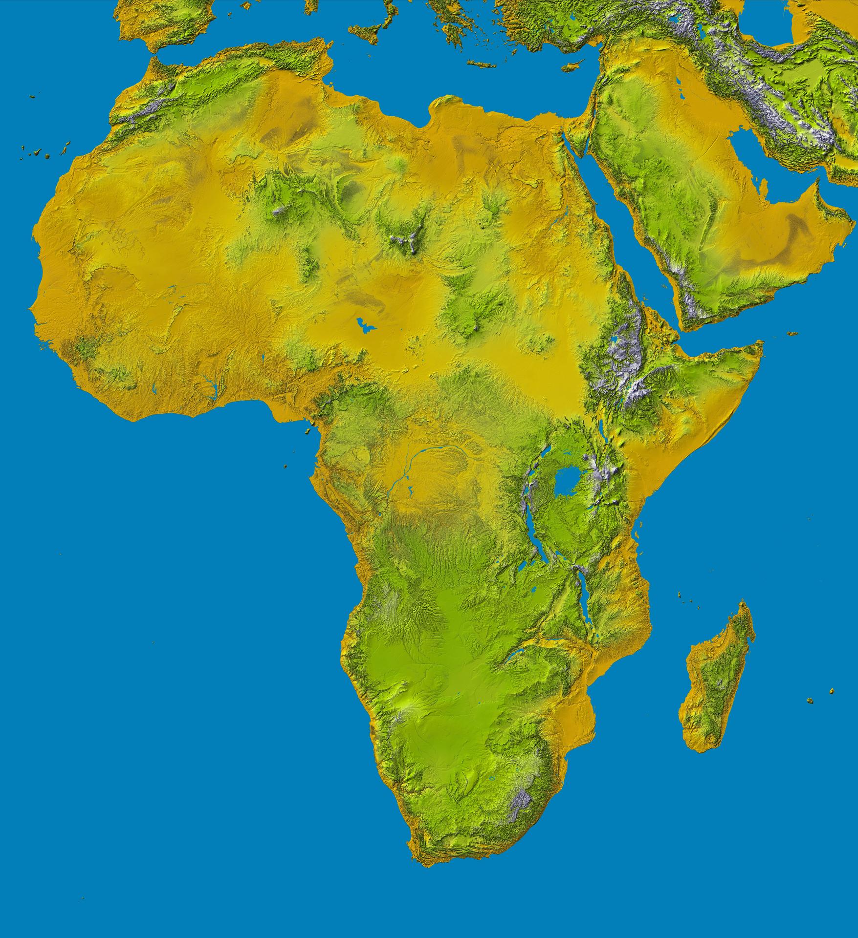 Elevation data at the highest possible resolution from NASA SRTM mission in February 2000 are being released for the first time for most of the African continent. This color shaded relief image shows the extent of SRTM digital elevation data for Africa.