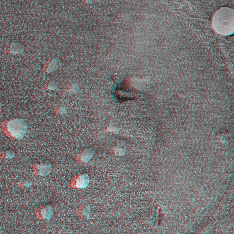 This 3-D anaglyph, from NASA Mars Exploration Rover Spirit, shows a circular imprint left in the Meridiani Planum soil by the rover Moessbauer spectrometer. 3D glasses are necessary.