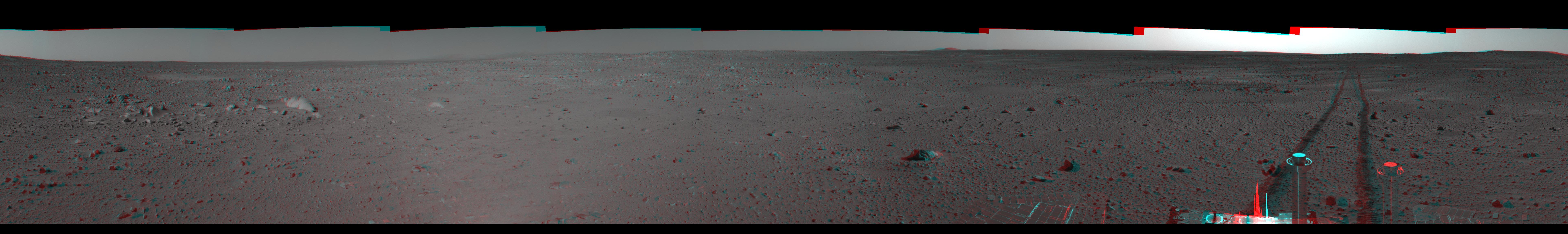 This 3-D cylindrical-perspective mosaic was created from navigation camera images that NASA Mars Exploration Rover Spirit captured on on sol 101. 3D glasses are necessary to view this image.