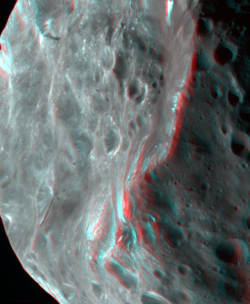 Phoebe violent, cratered past is evident in this 3D image of the tiny moon captured by NASA Cassini spacecraft. 3D glasses are necessary to view this image.