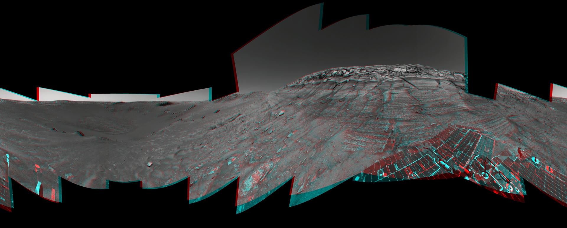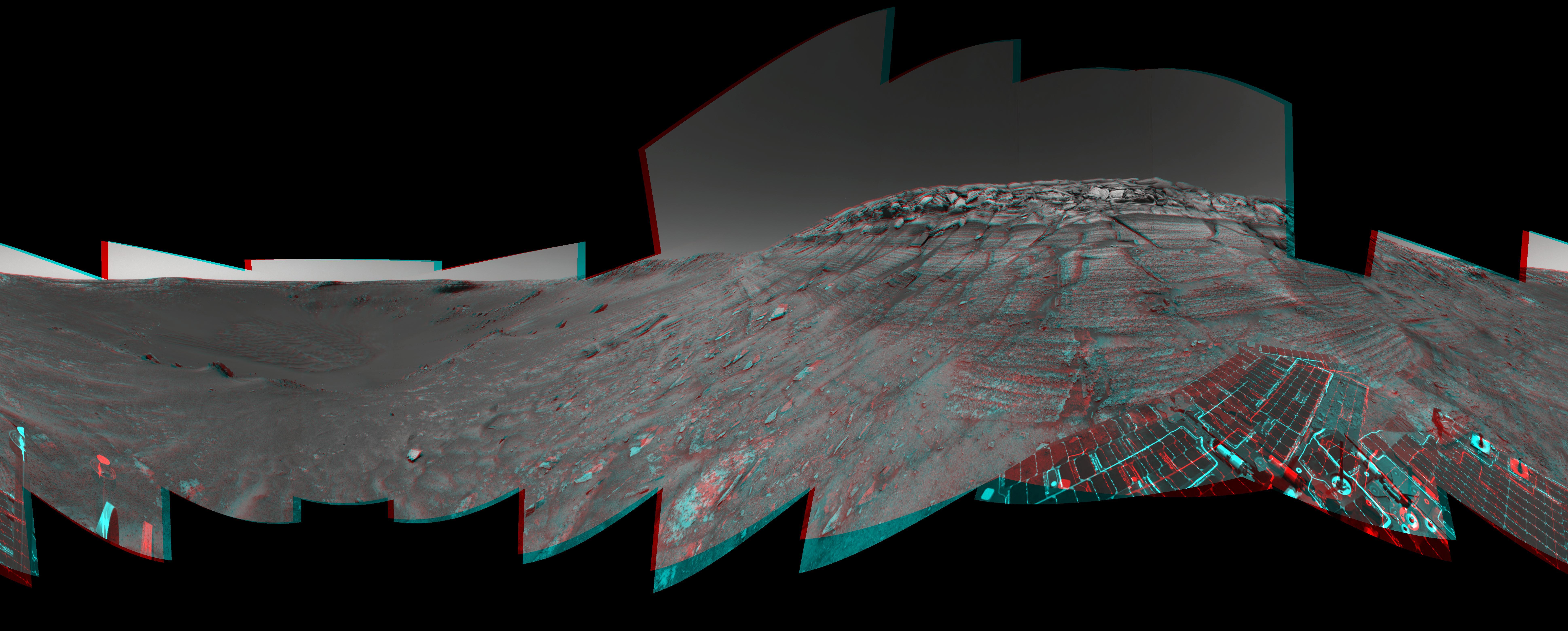 NASA Mars Exploration Rover Opportunity reached the base of Burns Cliff, a portion of the inner wall of Endurance Crater in this anaglyph from the rover 285th martian day Nov. 11, 2004. 3D glasses are necessary to view this image.