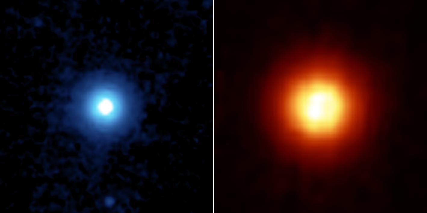NASA's Spitzer Space Telescope recently captured these images of the star Vega, located 25 light years away in the constellation Lyra. Spitzer was able to detect the heat radiation from the cloud of dust around the star and found that the debris disc is much larger than previously thought. This side by side comparison, taken by Spitzer's multiband imaging photometer, shows the warm infrared glows from dust particles orbiting the star at wavelengths of 24 microns (figure 2 in blue) and 70 microns (figure 3 in red). Both images show a very large, circular and smooth debris disc. The disc radius extends to at least 815 astronomical units. (One astronomical unit is the distance from Earth to the Sun, which is 150-million kilometers or 93-million miles). Scientists compared the surface brightness of the disc in the infrared wavelengths to determine the temperature distribution of the disc and then infer the corresponding particle size in the disc. Most of the particles in the disc are only a few microns in size, or 100 times smaller than a grain of Earth sand. These fine dust particles originate from collisions of embryonic planets near the star at a radius of approximately 90 astronomical units, and are then blown away by Vega's intense radiation. The mass and short lifetime of these small particles indicate that the disc detected by Spitzer is the aftermath of a large and relatively recent collision, involving bodies perhaps as big as the planet Pluto. The images are 3 arcminutes on each side. North is oriented upward and east is to the left. http://photojournal.jpl.nasa.gov/catalog/PIA07218