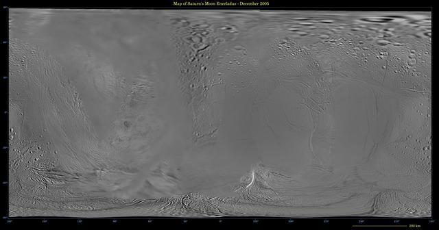This global digital map of Saturn moon Enceladus was created using data taken during Cassini and Voyager spacecraft flybys. The map is an equidistant projection and has a scale of 110 meters 361 feet per pixel