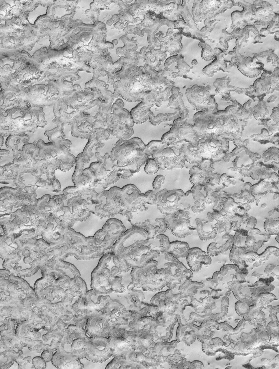 This MOC image shows an undulating scene in the south polar region of Mars. Small, elevated mesas of smooth, relatively homogeneous-appearing material are separated by low-lying regions that are speckled and darkened in some local areas