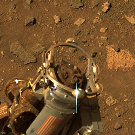 This image shows the round, metallic working end of the rock abrasion tool at the end of a metallic cylinder. The flat grinding face, attached brush, and much of the smooth, metallic exterior of cylinder are covered with a deep reddish-brown layer of dust