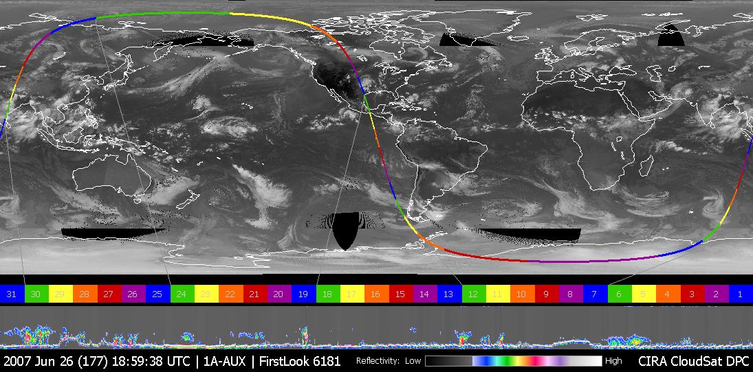 This image was taken on June 26, 2007, UTC 20:00. In this image an obvious storm hangs over the middle of the United States. Figure 1 shows NASA CloudSat data looking, in profile, at the cloud in this storm.