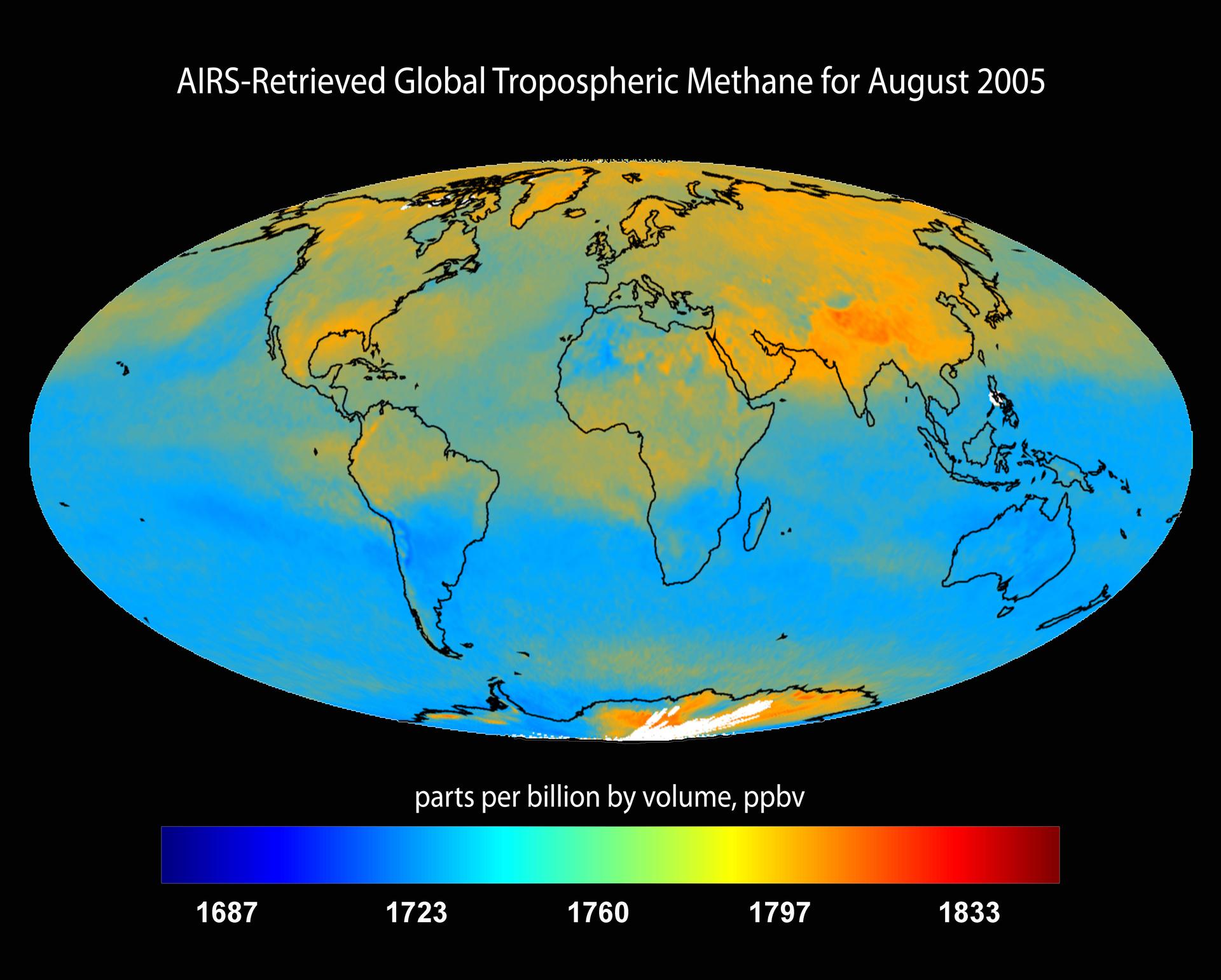 Global tropospheric methane for August 2005 retrieved from the Atmospheric Infrared Sounder AIRS on NASA Aqua satellite.