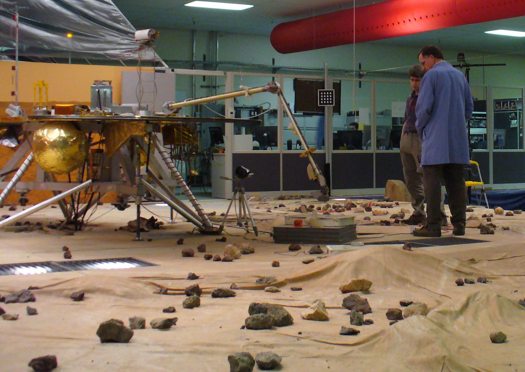 Members of NASA Phoenix Mars Mission Robotic Arm engineering team test the arm motorized rasp in the Payload Interoperability Testbed at the University of Arizona, Tucson.
