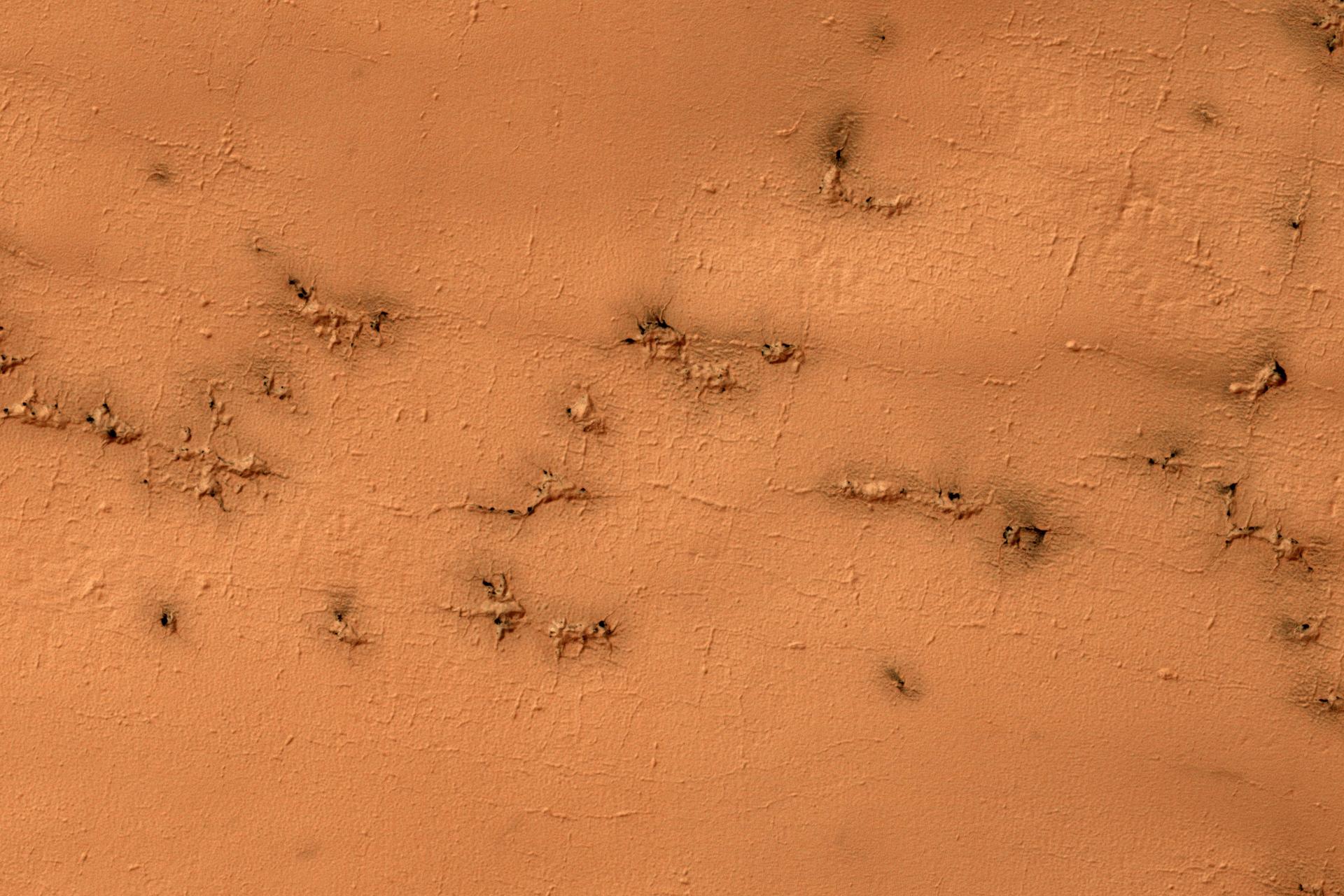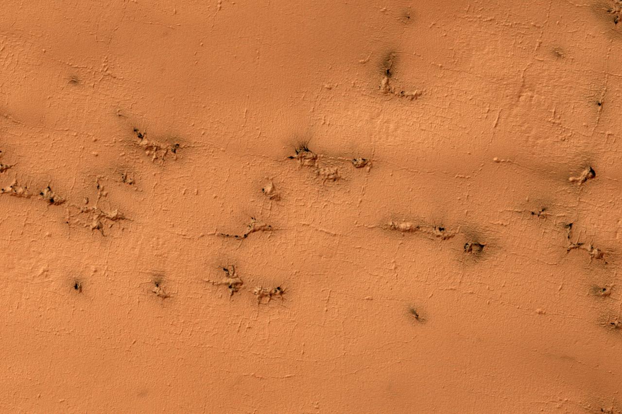 Ground that has a lot of water ice mixed with dirt tends to crack in polygonal patterns bounded by short straight channels. In the South Polar region of Mars this type of terrain may be covered by a seasonal polar cap composed of dry ice. In the spring as the seasonal cap sublimates gas is trapped underneath the seasonal ice layer until it can escape to an opening. At this site, faint rectangular channels in the surface are visible. The escaping carbon dioxide gas has exploited these channels and in the process, deepened them and added sinuosity to the formerly straight segments. http://photojournal.jpl.nasa.gov/catalog/PIA11238