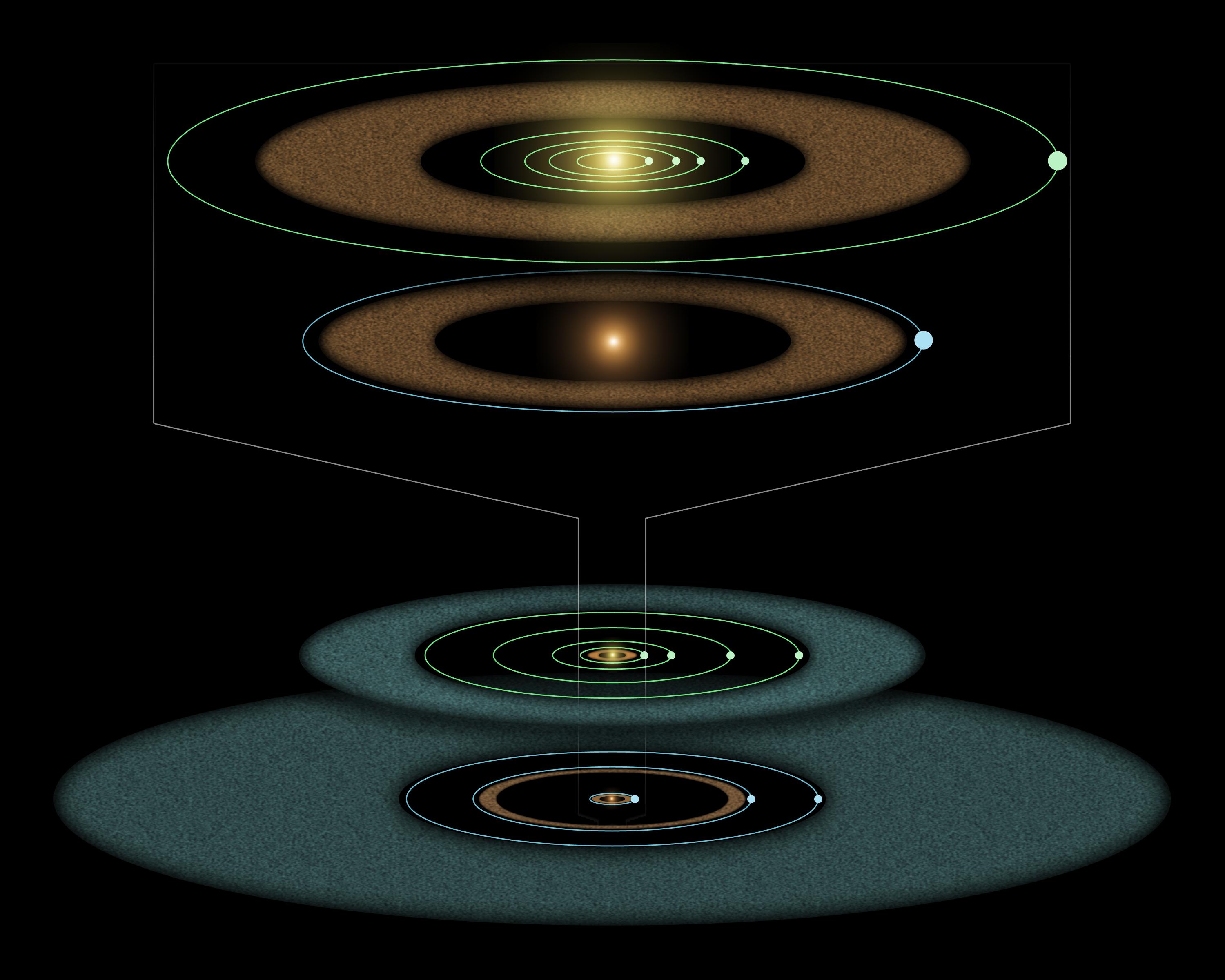This artist diagram based on observations from NASA Spitzer Space Telescope compares the Epsilon Eridani system to our own solar system. The two systems are structure