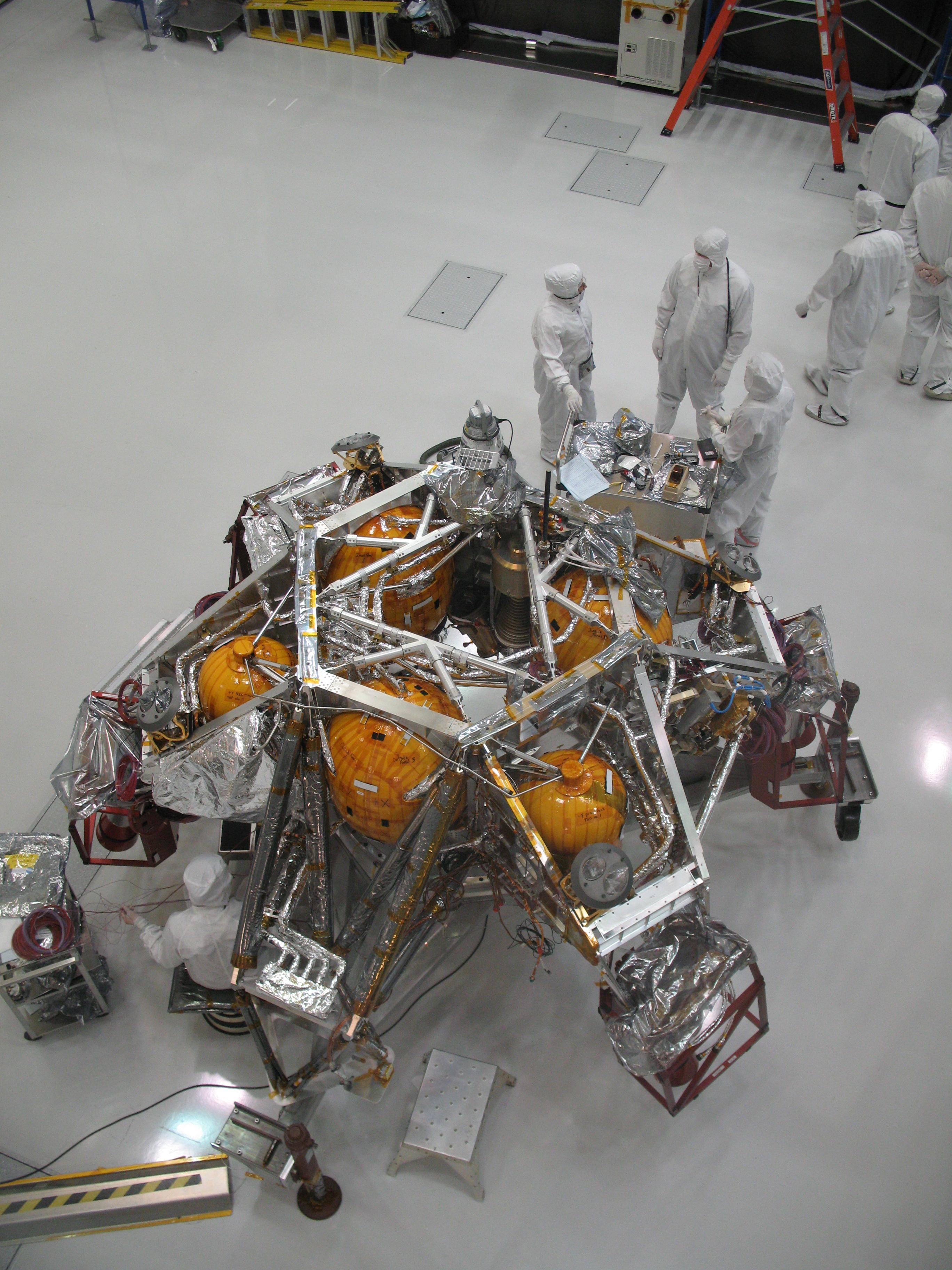 This image from early October 2008 shows personnel working on the descent stage of NASA Mars Science Laboratory inside the Spacecraft Assembly Facility at NASA Jet Propulsion Laboratory, Pasadena, Calif.