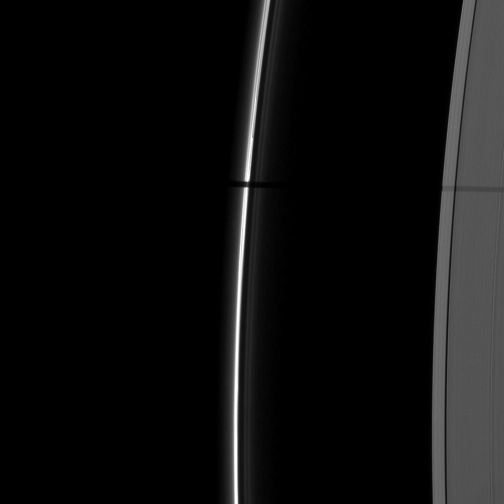 A wide shadow is cast onto the thin F ring and the A ring by the moon Janus in this image taken as Saturn approached its August 2009 equinox.
