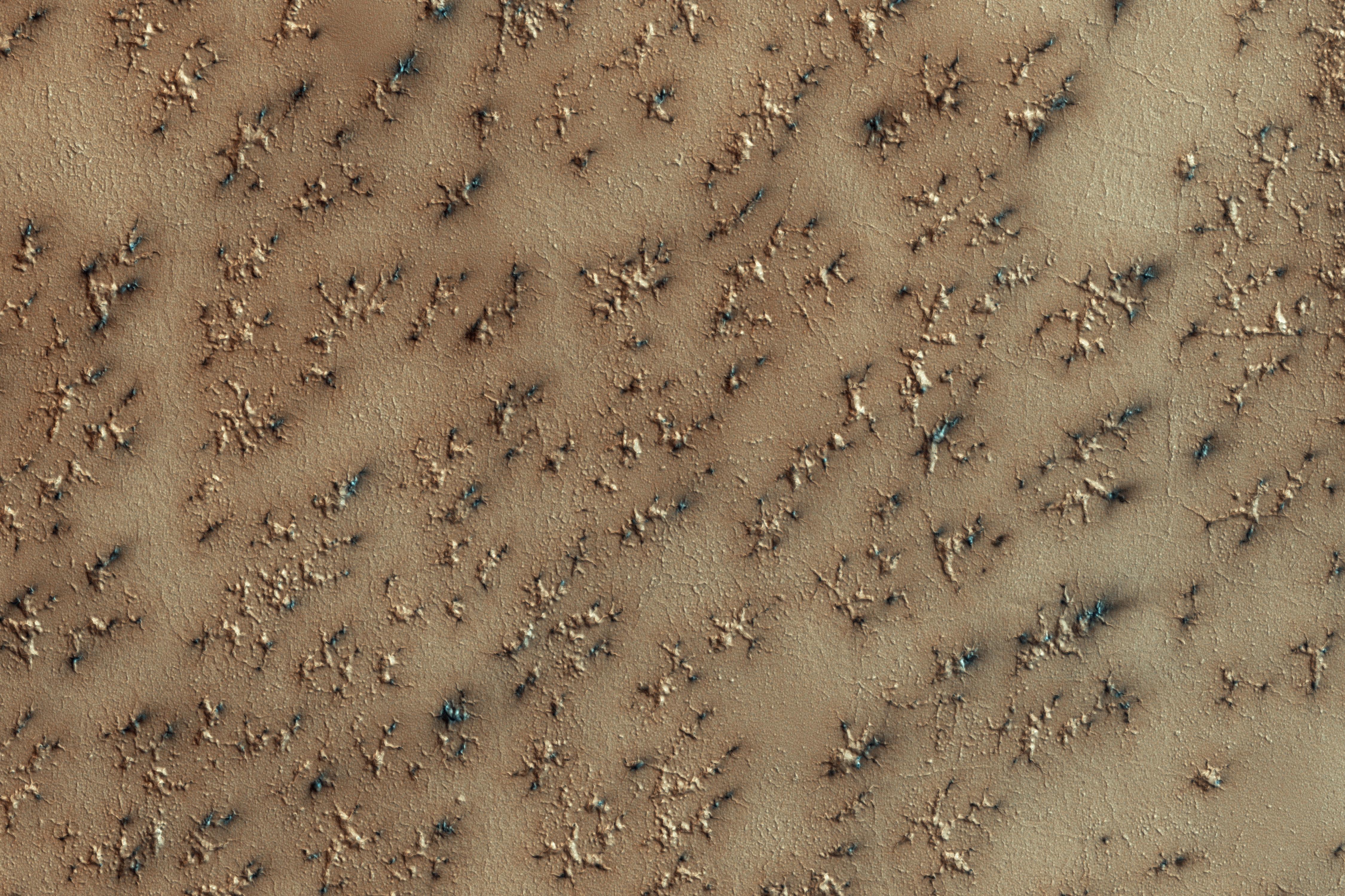 NASA Mars Reconnaissance Orbiter spies a layer of dry ice covering Mars south polar layer. In the spring, gas created from heating of the dry ice escapes through ruptures in the overlying seasonal ice, entraining material from the ground below. The gas erodes channels in the surface, generally exploiting weaker material. The ground likely started as polygonal patterned ground (common in water-ice-rich surfaces), and then escaping gas widened the channels. Fans of dark material are bits of the surface carried onto the top of the seasonal ice layer and deposited in a direction determined by local winds. http://photojournal.jpl.nasa.gov/catalog/PIA11706
