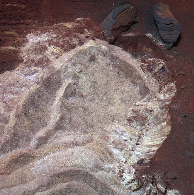 The soft soil exposed when wheels of NASA Mars Exploration Rover Spirit dug into a patch of ground dubbed Troy exhibit variations in hue visible in this image, in which the colors have been stretched to emphasize the differences.