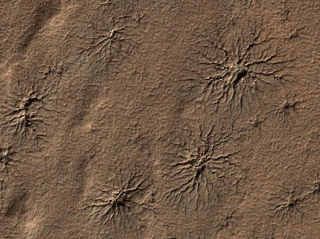 The High Resolution Imaging Science Experiment camera on NASA Mars Reconnaissance Orbiter captured this image of spider-shaped features on Mars, carved by vaporizing dry ice.