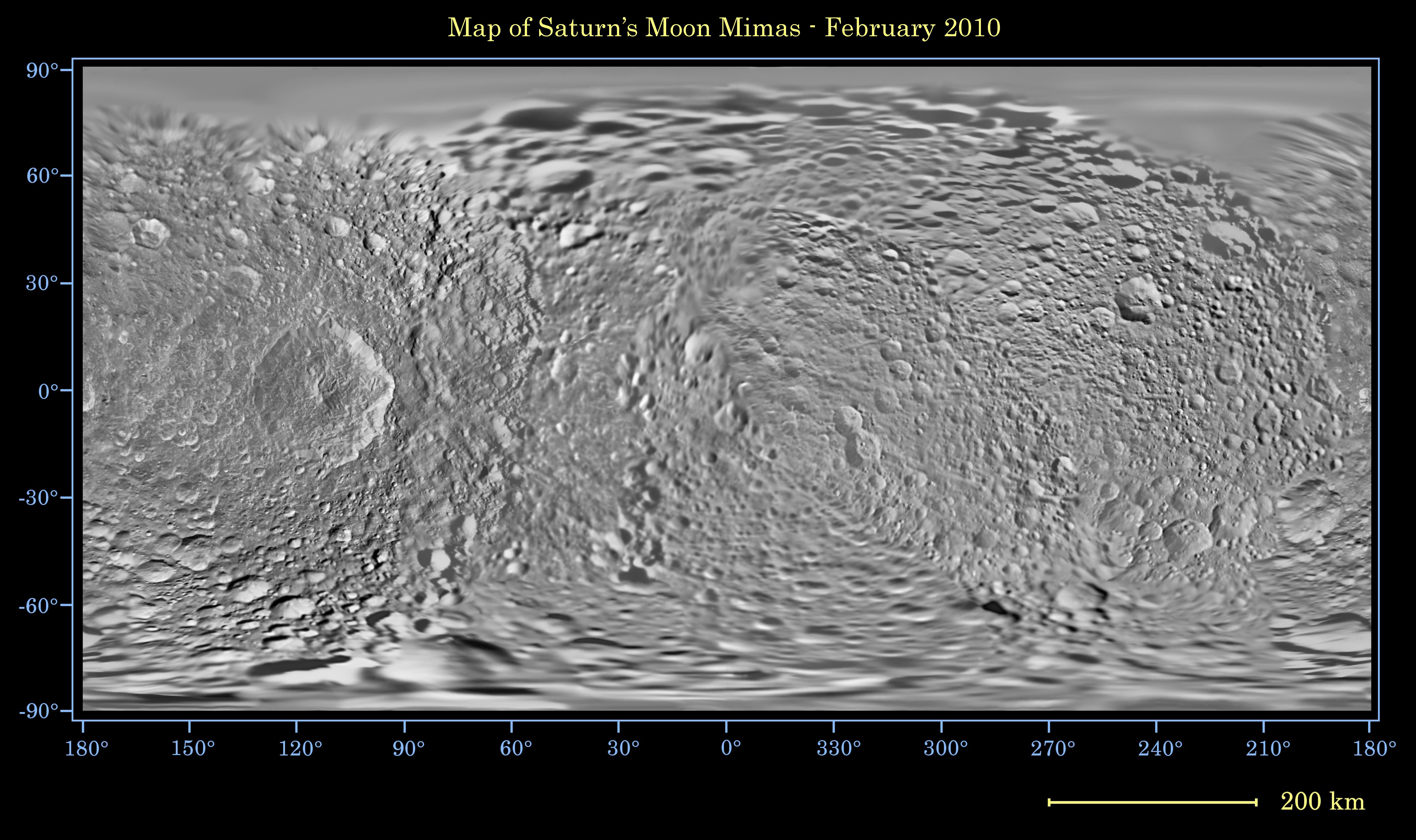 This global map of Saturn moon Mimas was created using images taken during NASA Cassini spacecraft flybys, with NASA Voyager images filling in the gaps in Cassini coverage.