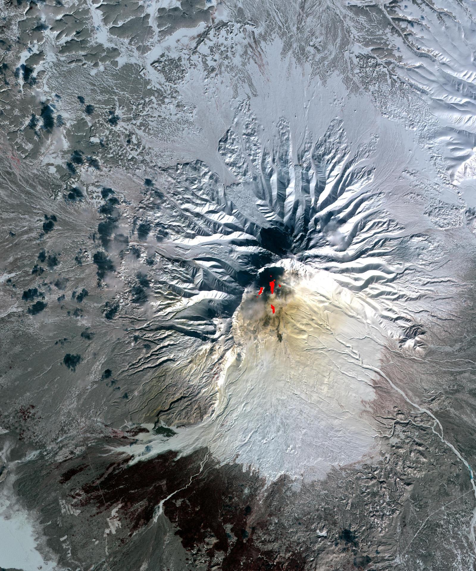 Sheveluch Volcano in Kamchatka, Siberia, is one of the frequently active volcanoes located in eastern Siberia. In this image from NASA Terra spacecraft, brownish ash covers the southern part of the mountain, under an ash-laden vertical eruption plume.