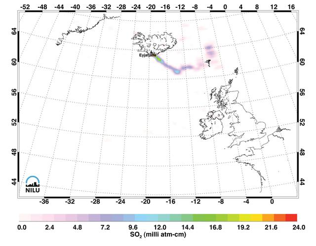 Images made with data from the Atmospheric Infrared Sounder on NASA Aqua satellite, show sulfur dioxide released from the volcanic eruption of Eyjafjallajökull.