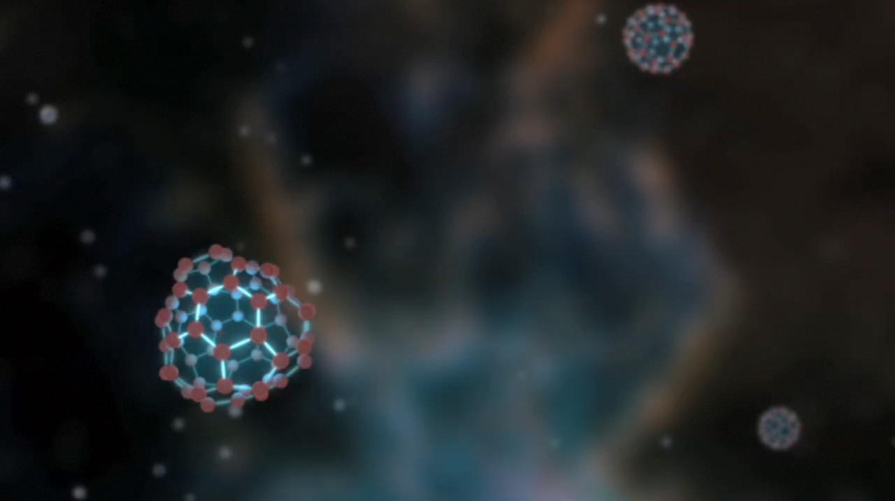 This artist image illustrates vibrating buckyballs -- spherical molecules of carbon discovered in space for the first time by NASA Spitzer Space Telescope.