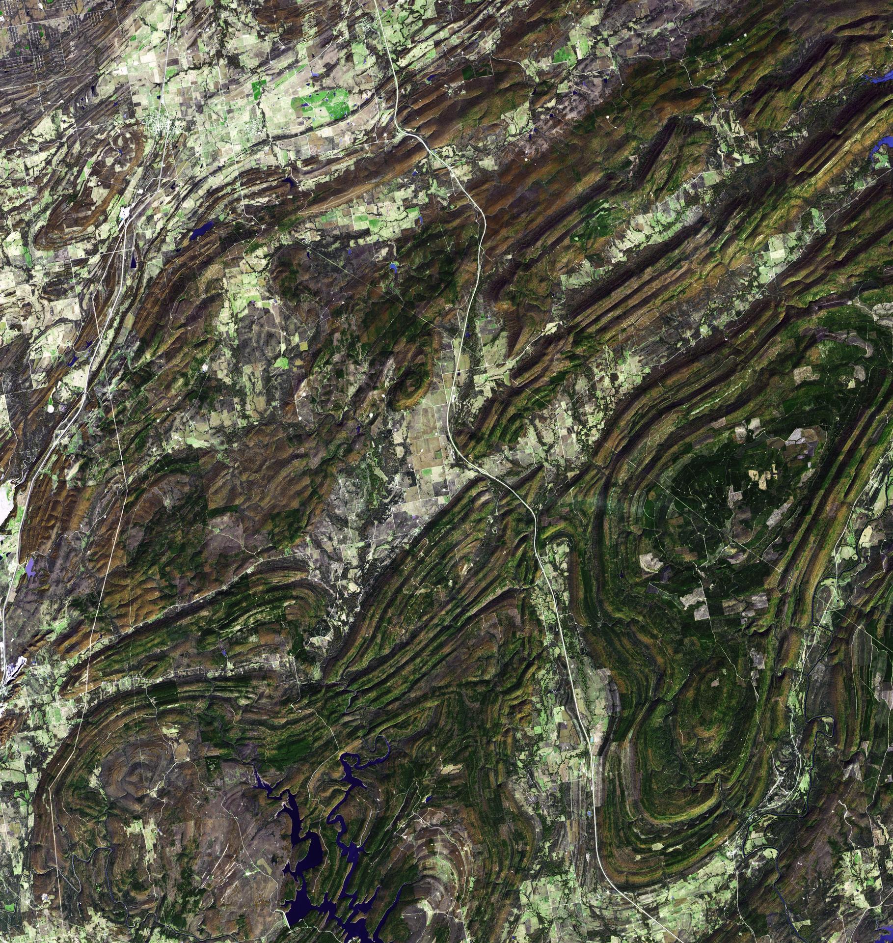 NASA Terra spacecraft captured this image of the Ouachita Mountains in southeast Oklahoma. The Ouachitas are fold mountains, formed about 300 million years ago when the South American Plate drifted northward, colliding with the North American Plate.
