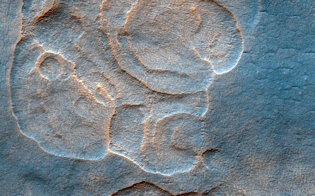 The western Utopia Planitia in the Northern mid-latitudes of Mars is marked by a peculiar type of depression with scalloped edges and by a network of polygonal fractures. The scalloped depressions are typical features; a smooth layered terrain located between 40 and 60 degrees in both hemispheres. Scalloped depressions probably form by removal of ice-rich subsurface material by sublimation (ice transforming directly from a solid to a gaseous state), a process that may still be active today. Isolated scalloped depressions generally have a steep pole-facing scarp and a gentler equator-facing slope. This asymmetry is interpreted as being the result of difference in solar heating. Scalloped depressions may coalesce, leading to the formation of large areas of pitted terrain. The polygonal pattern of fractures resembles permafrost polygons that form in terrestrial polar and high alpine regions by seasonal-to-annual contraction of the permafrost (permanently frozen ground). On Earth, such polygons indicate the presence of ground ice. These landforms most likely show that sub-surface ice is present or has been present geologically recently at these latitudes, and they may slowly be continuing their development at the present time. http://photojournal.jpl.nasa.gov/catalog/PIA13485