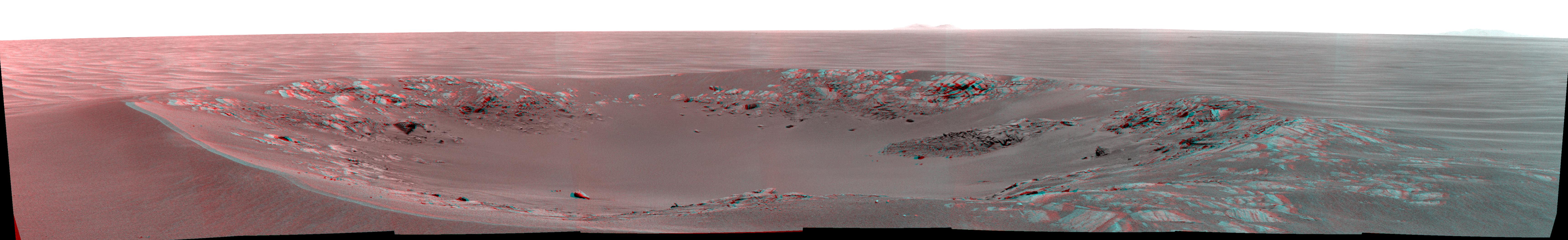 Intrepid crater on Mars carries the name of the lunar module of NASA Apollo 12 mission, which landed on Earth moon Nov. 19, 1969. NASA Mars Exploration Rover Opportunity recorded this stereo view on Nov. 11, 2010. 3D glasses are necessary.