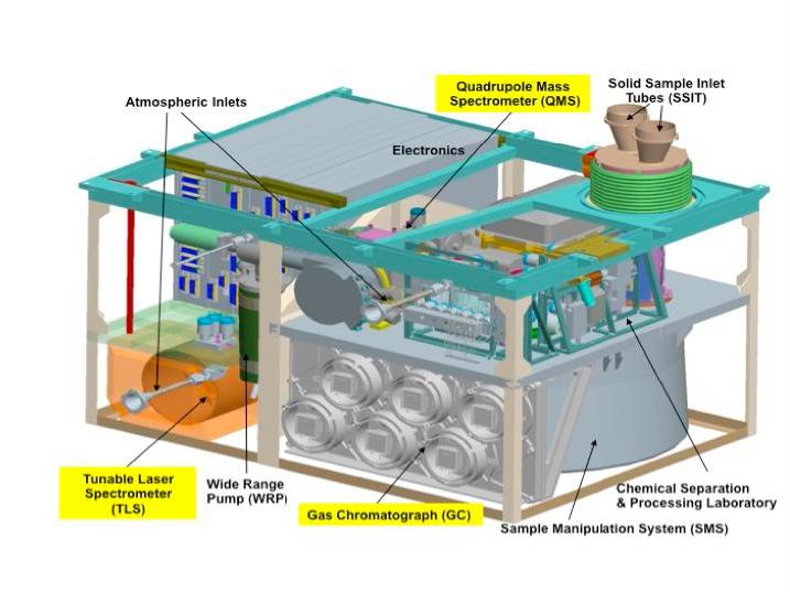 This schematic illustration for NASA Mars Science Laboratory Sample Analysis at Mars SAM instrument shows major components of the microwave-oven-size instrument, which will examine samples of Martian rocks, soil and atmosphere.