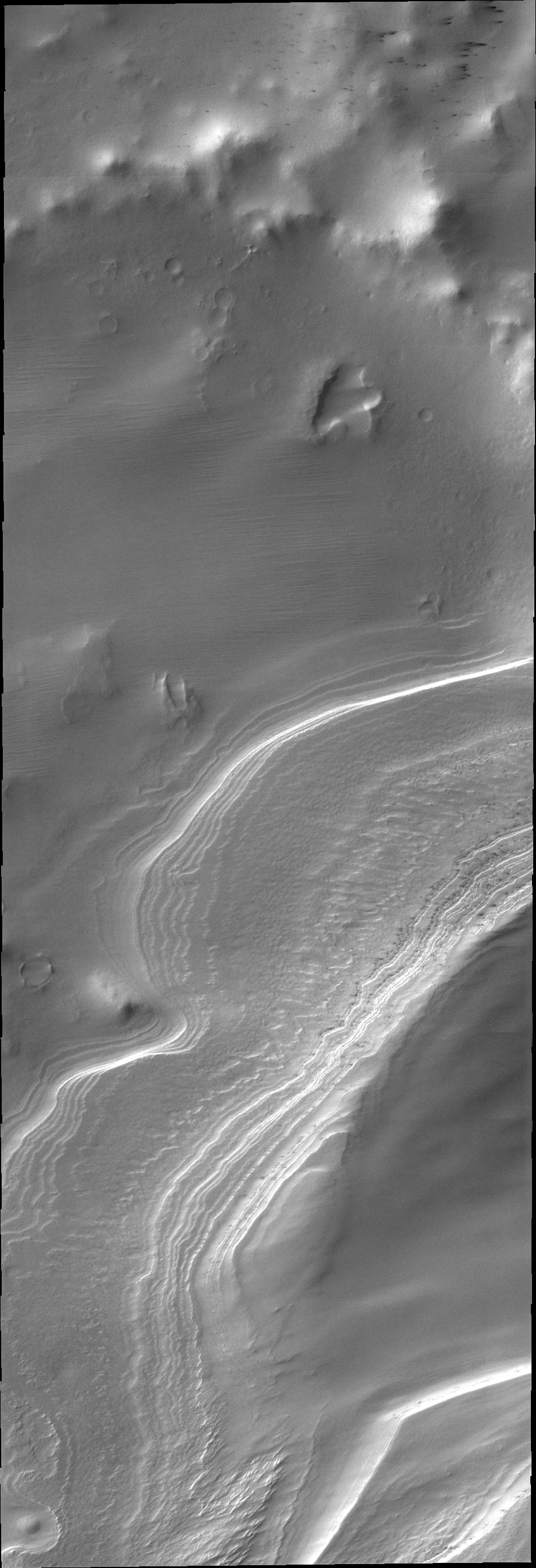 Layering in south polar ice is easy to see in this outlier of the main polar cap. This image was captured by NASA Mars Odyssey.