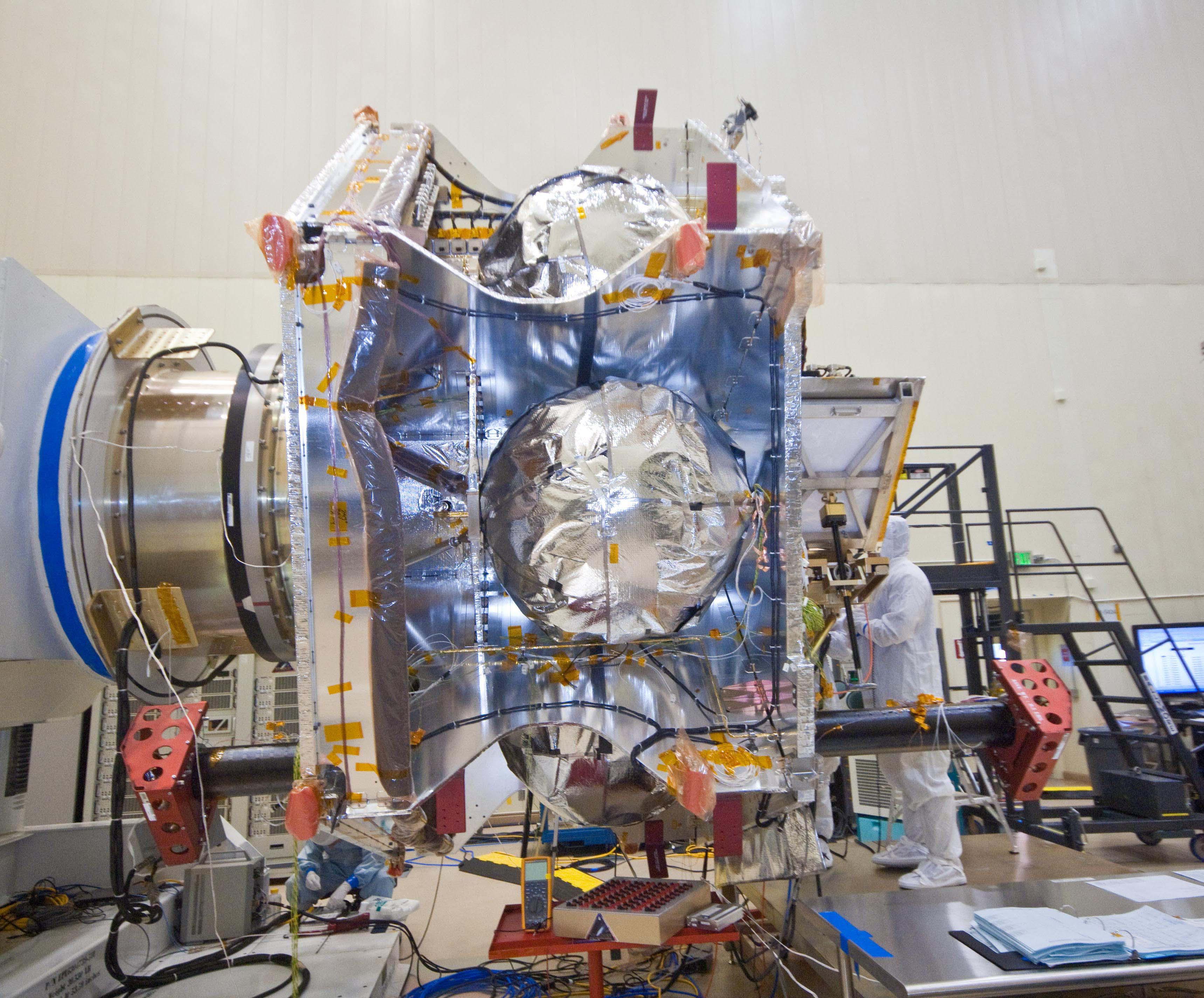 An exposed, side view of NASA Juno spacecraft during its assembly features three of the spacecraft spherical propellant tanks.