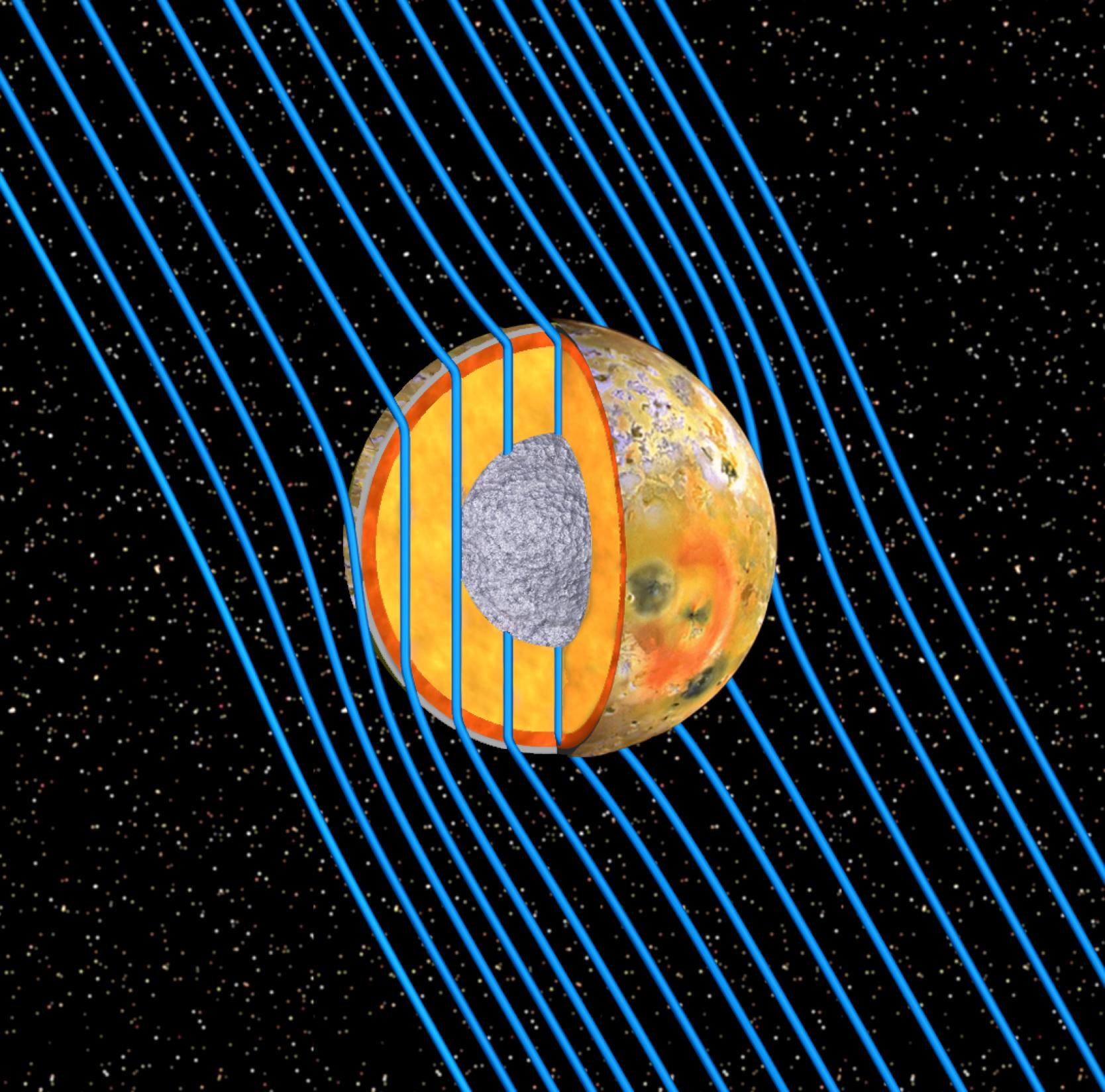 This graphic shows the internal structure of Jupiter moon Io as revealed by data from NASA Galileo spacecraft. Io is bathed in magnetic field lines shown in blue that connect the north polar region of Jupiter to the planet south polar region.