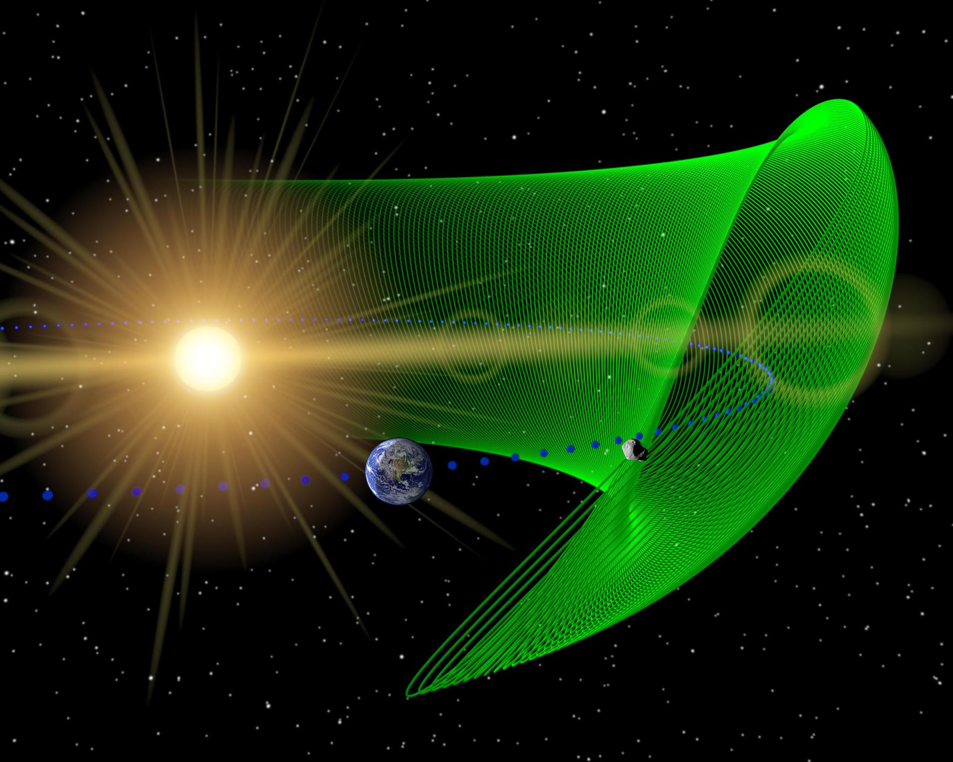 This artist concept illustrates the first known Earth Trojan asteroid, discovered by NEOWISE, the asteroid-hunting portion of NASA WISE mission. The asteroid is shown in gray and its extreme orbit is shown in green. Objects are not drawn to scale.