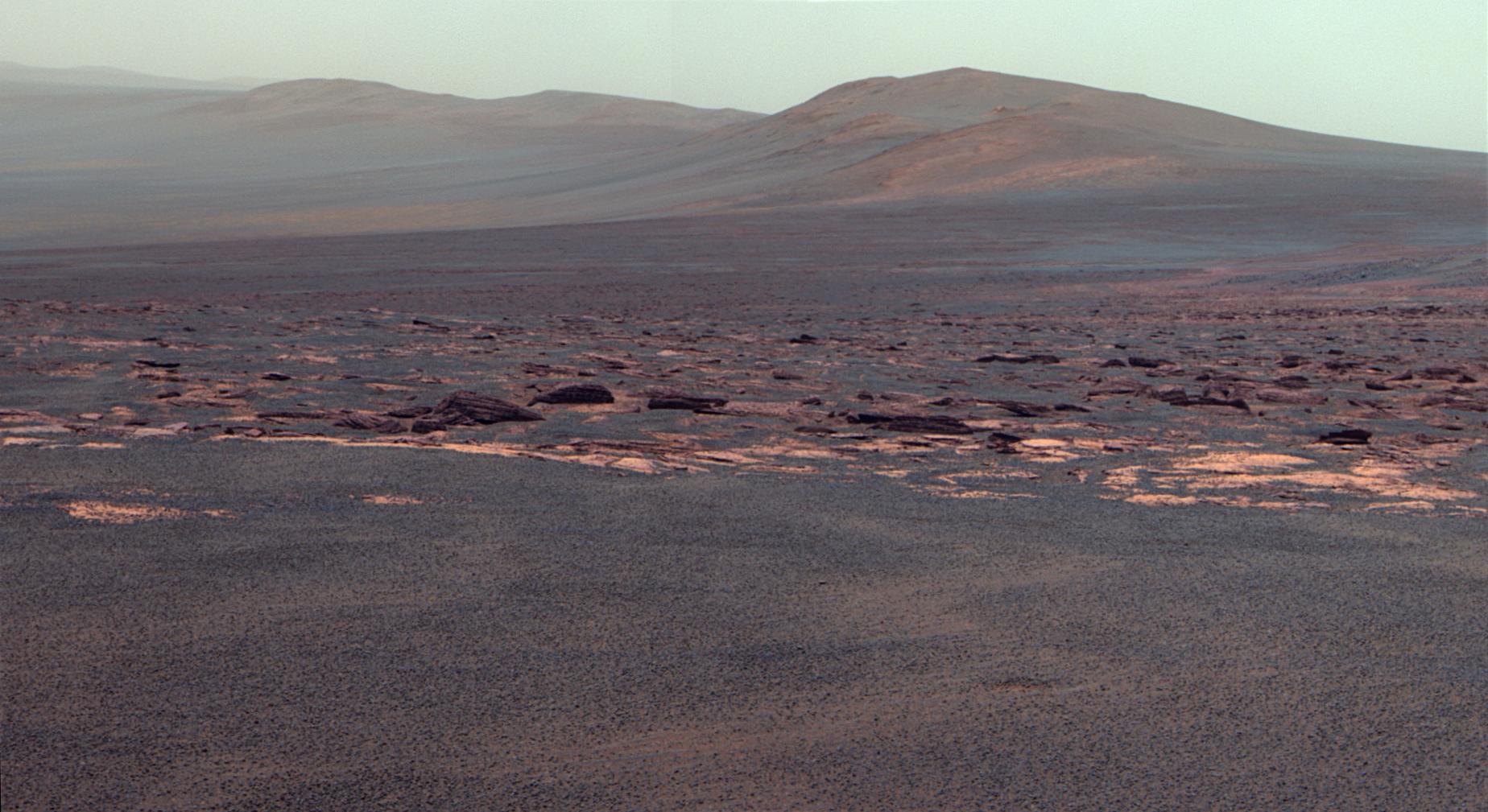 A portion of the west rim of Endeavour crater sweeps southward in this image from NASA Mars Exploration Rover Opportunity. The view is presented in false color to emphasize differences among materials in the rocks and the soils.