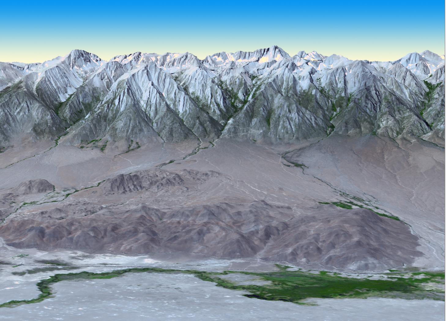 At 14,505 feet high, Mt. Whitney, the highest point in the contiguous U.S., is located in California Sierra Nevada Mountains, on the west side of Owens Valley. The Alabama Hills appear in the foreground of this image from NASA Terra spacecraft.