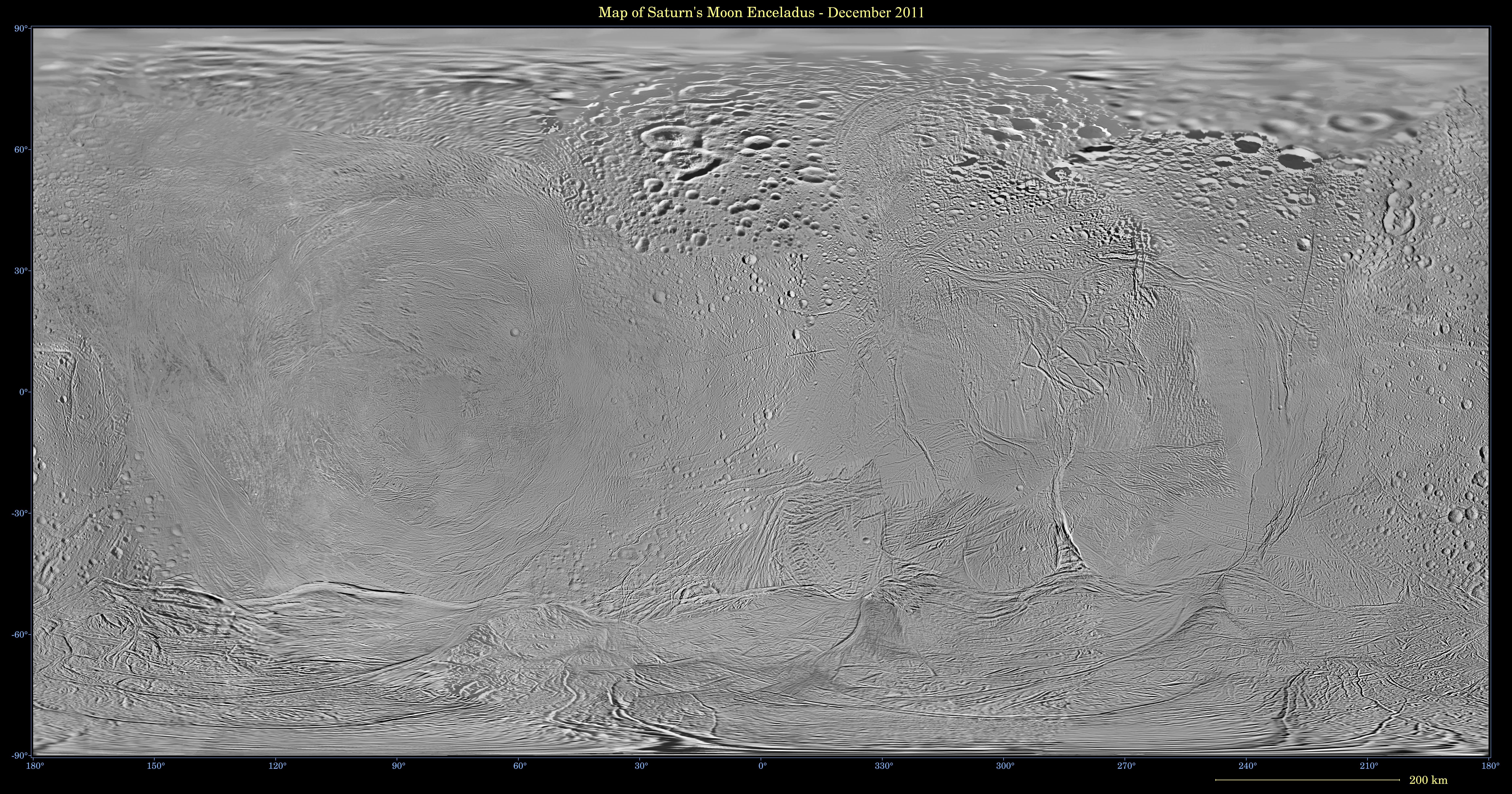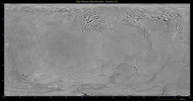 This mosaic shows an updated global map of Saturn icy moon Enceladus, created using images taken during flybys of NASA Cassini spacecraft. The map incorporates new images taken during flybys in December 2011.