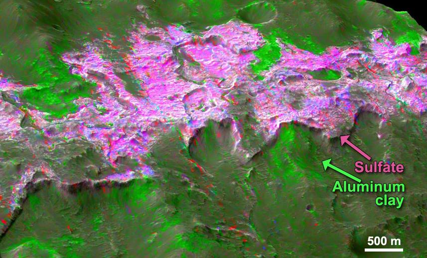 Sulfates are found overlying clay minerals in sediments within Columbus Crater, a depression that likely hosted a lake in the past in this image based on information from NASA Mars Reconnaissance Orbiter.