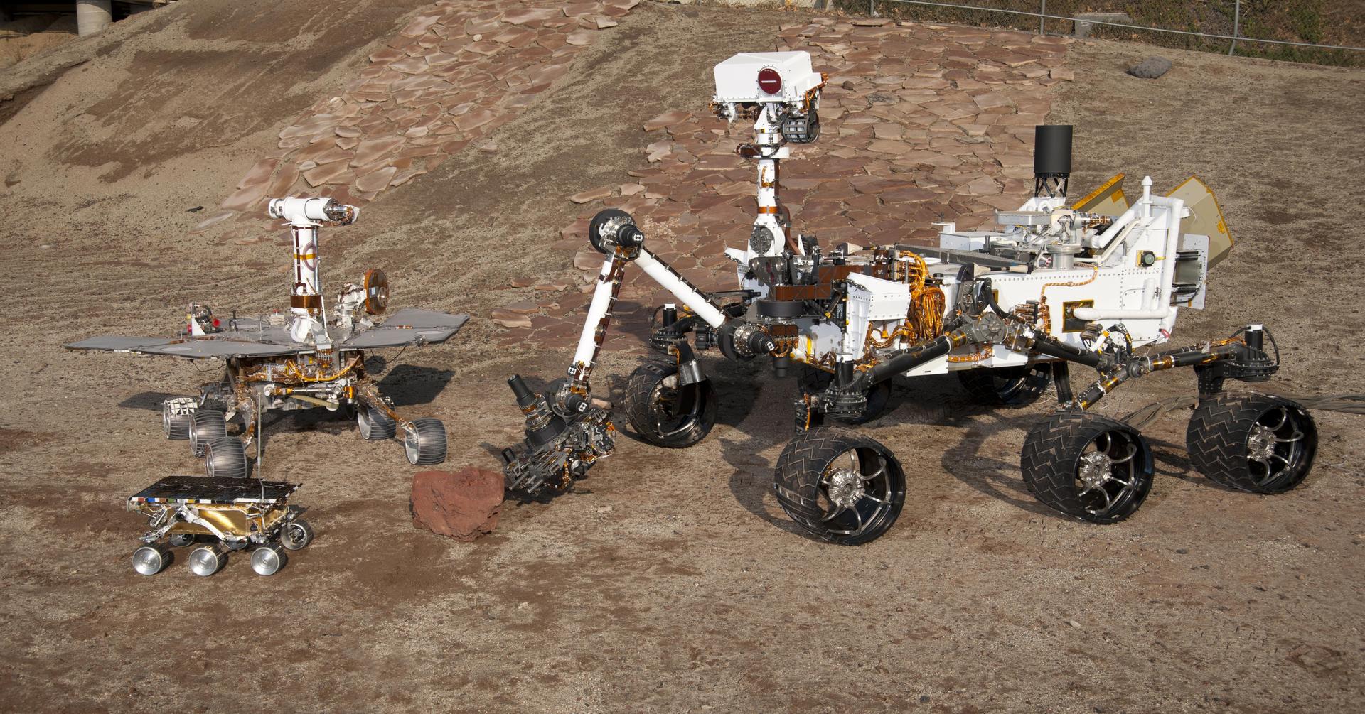 This grouping of two test rovers and a flight spare provides a graphic comparison of three generations of Mars rovers developed at NASA Jet Propulsion Laboratory, Pasadena, Calif. The setting is JPL Mars Yard testing area.