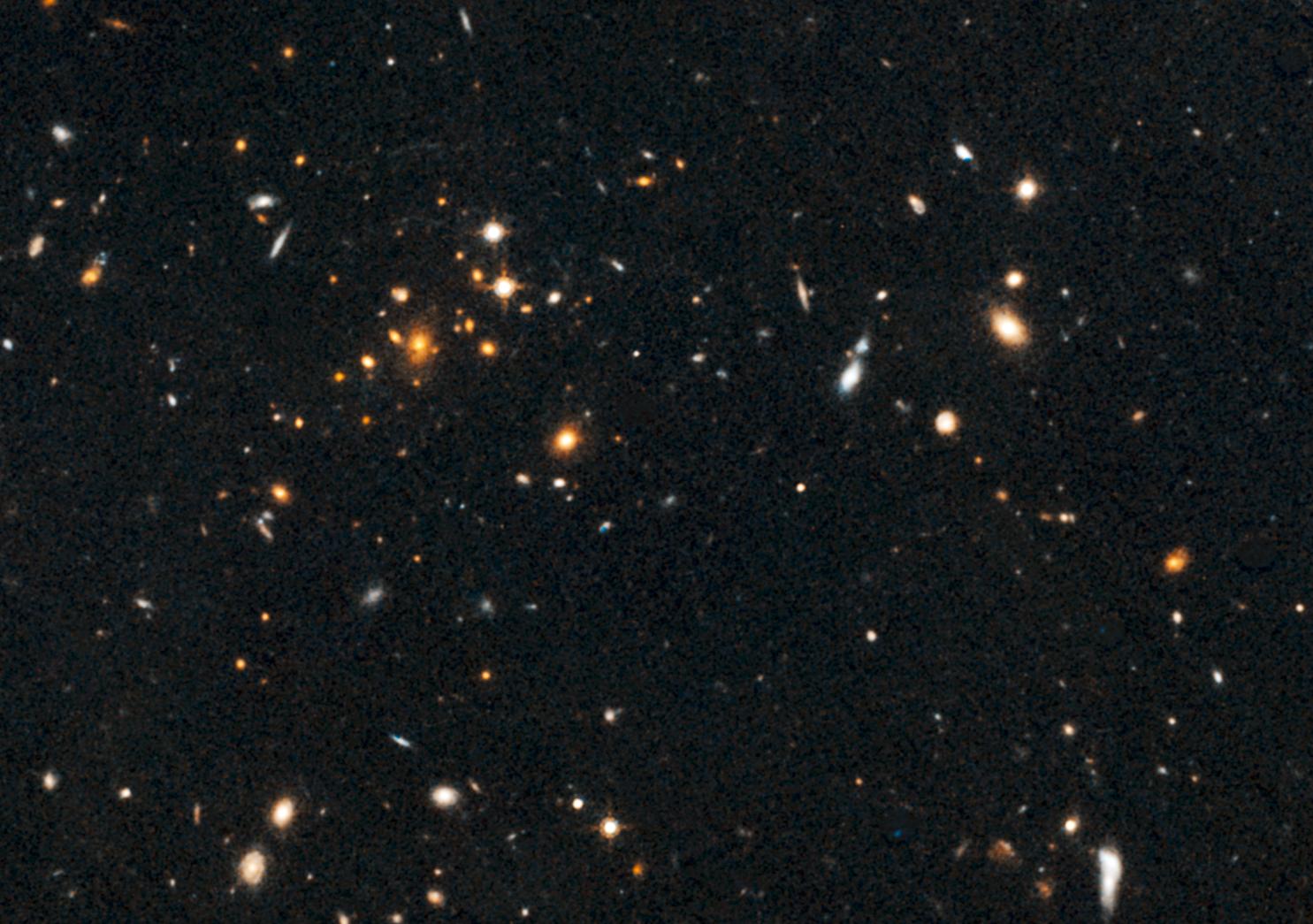 Astronomers using NASA Hubble Space Telescope have found a puzzling arc of light behind an extremely massive cluster of galaxies residing 10 billion light-years away.