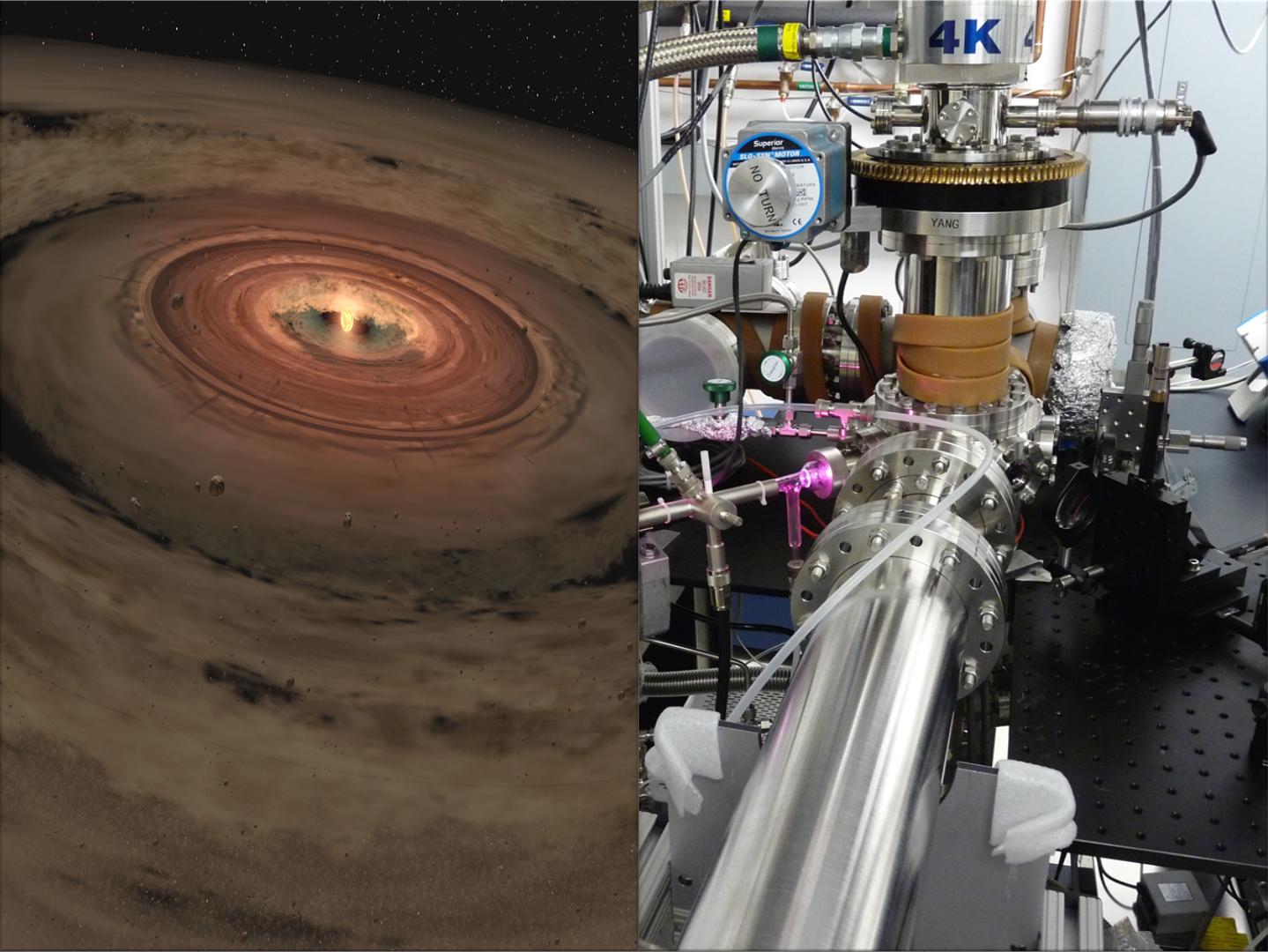 Researchers are brewing up icy, organic concoctions in the lab to mimic materials at the edge of our solar system and beyond. The lab is shown at right, and a very young solar system, with its swirling planet-forming disk is at left.