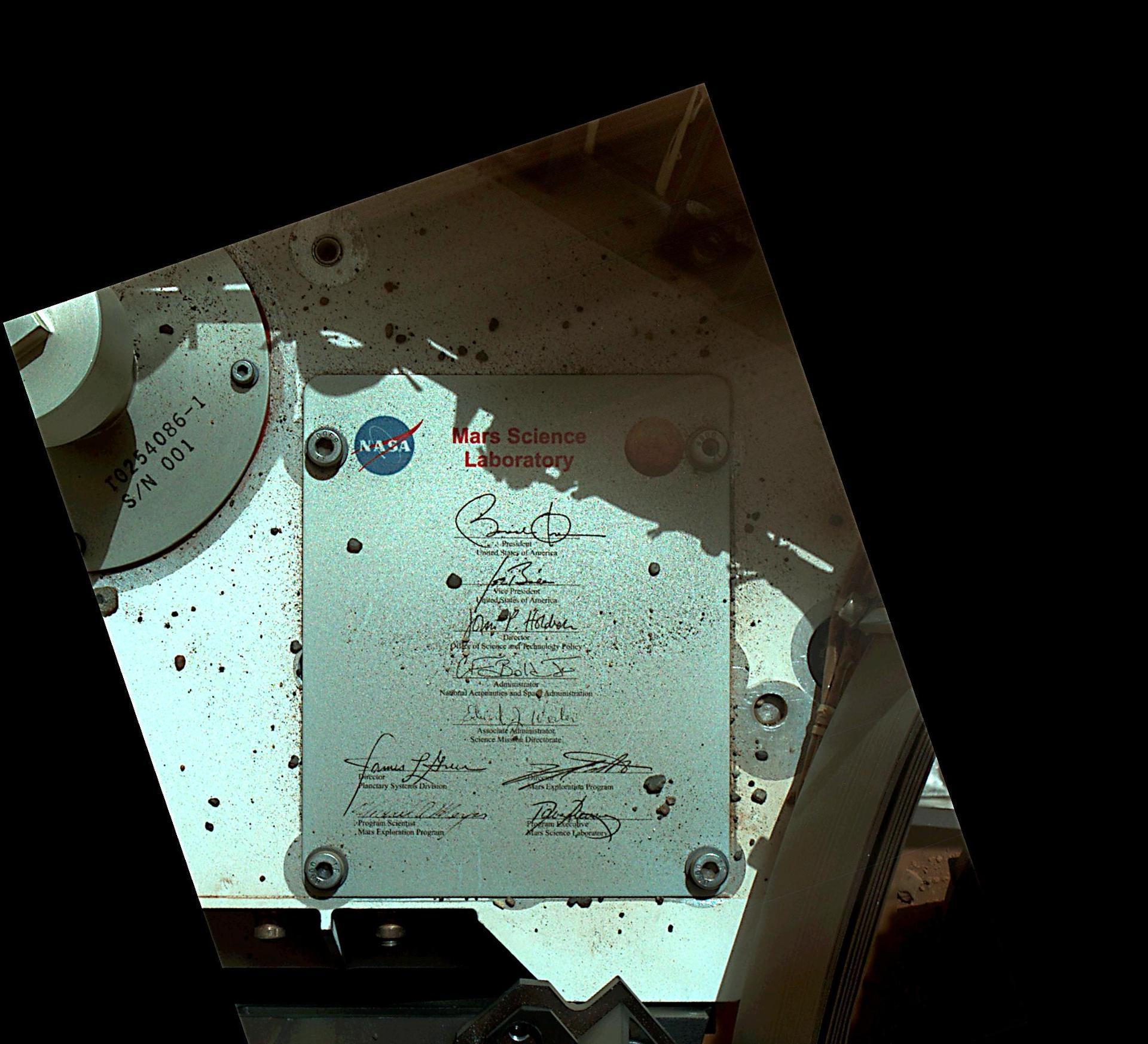 This view of Curiosity deck shows a plaque bearing several signatures of US officials, including that of President Obama and Vice President Biden. The image was taken by the rover Mars Hand Lens Imager MAHLI.