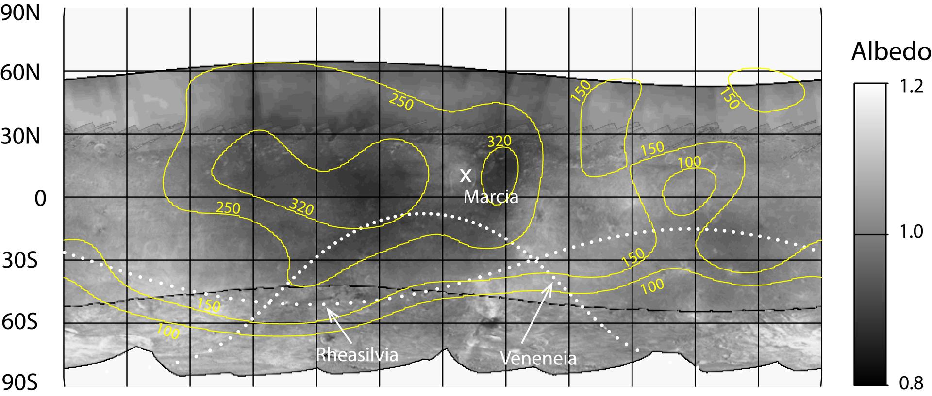Hydrogen is most abundant in areas with low reflectivity, or albedo, on the giant asteroid Vesta, as shown in this contour map from NASA Dawn mission.