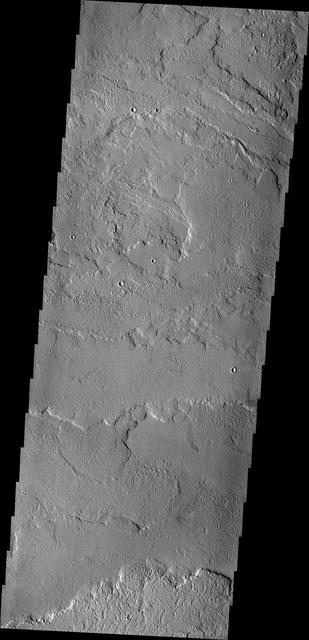 This image from NASA 2001 Mars Odyssey spacecraft shows some of the extensive volcanic flows east of the large Tharsis volcanoes.