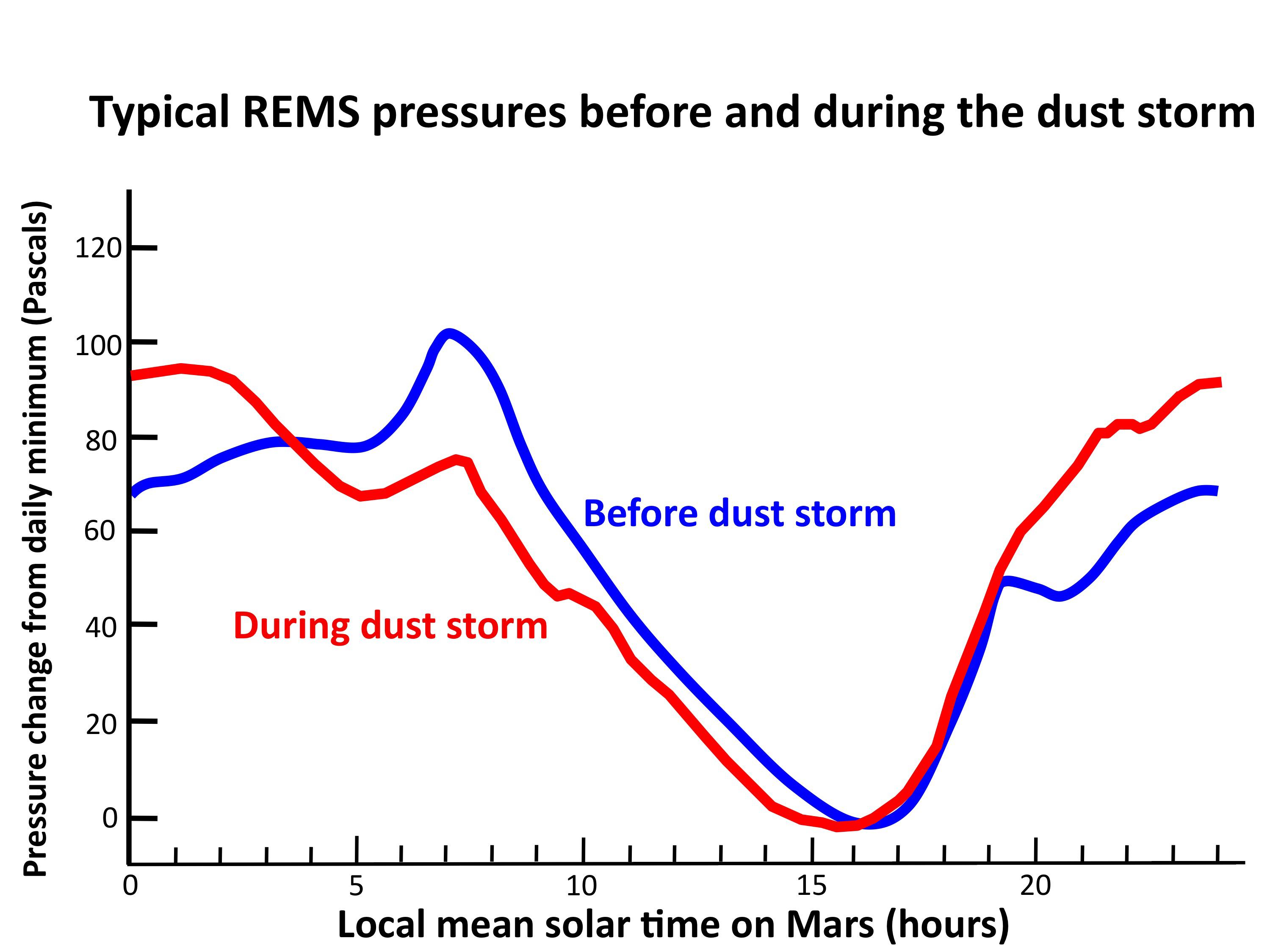 This graph compares a typical daily pattern of changing atmospheric pressure blue with the pattern during a regional dust storm hundreds of miles away red. The data are by the Rover Environmental Monitoring Station REMS on NASA Curiosity rover.