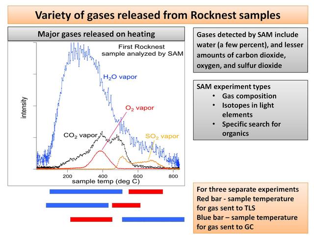 This plot of data from NASA Mars rover Curiosity shows the variety of gases that were released from sand grains upon heating in the Sample Analysis at Mars instrument, or SAM.