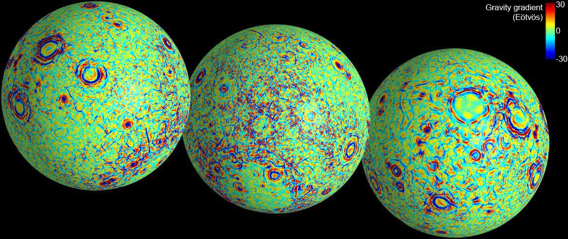 These maps of the near and far side of the moon show gravity gradients as measured by NASA GRAIL mission. Red and blue areas indicate stronger gradients due to underlying mass anomalies.
