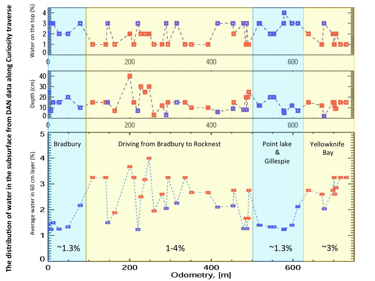 This set of graphs shows variation in the amount and the depth of water detected beneath NASA Mars rover Curiosity by use of the rover Dynamic Albedo of Neutrons DAN instrument at different points the rover has driven.