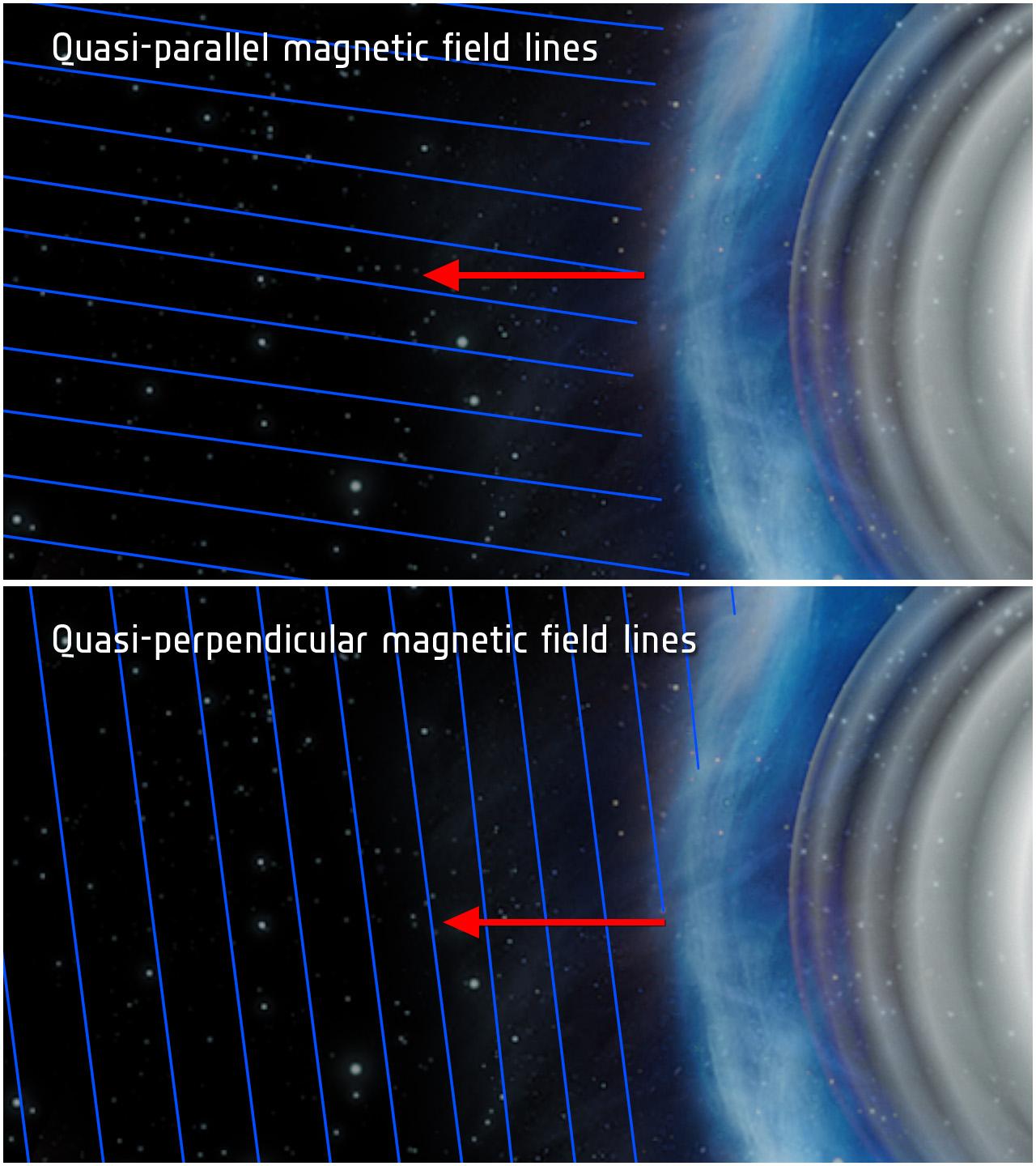 This illustration shows quasi-parallel top and quasi-perpendicular bottom magnetic field conditions at a planetary bow shock. Bow shocks are shockwaves created when the solar wind blows on a planet magnetic field.