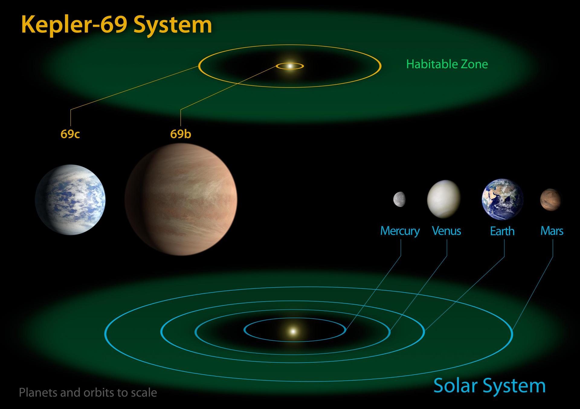 This diagram compares the planets of the inner solar system to Kepler-69, a two-planet system about 2,700 light-years from Earth in the constellation Cygnus.