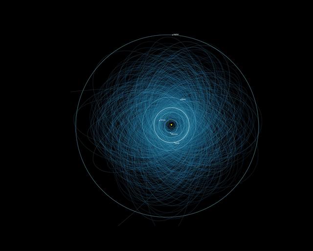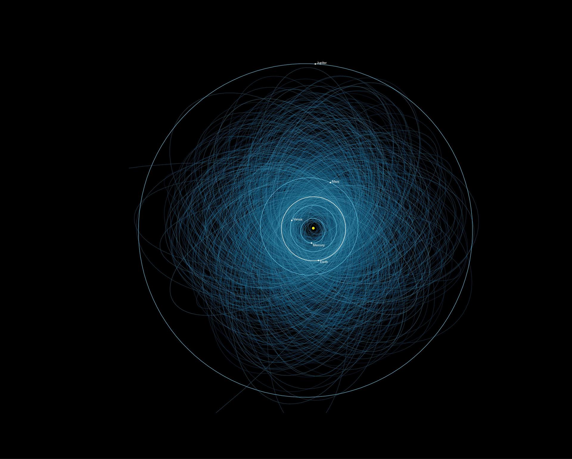 This graphic shows the orbits of all the known Potentially Hazardous Asteroids PHAs, numbering over 1,400 as of early 2013.