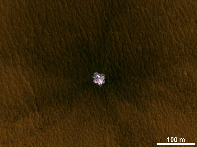 The image is an excerpt from an observation from NASA Mars Reconnaissance Orbiter showing a meteorite impact that excavated this crater on Mars exposed bright ice that had been hidden just beneath the surface at this location.